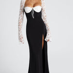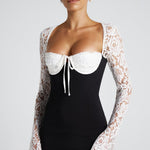 Aria Maxi Haljina u Crnoj/Bijeloj boji je savršena kombinacija elegancije i privlačnosti. Dizajnirana da ostavi dojam, ova haljina maxi dužine ima kontrastne prozirne čipkaste rukave s delikatnim picot rubom. Nabrana čipkasta nadogradnja na košaricama pojačava složene detalje, dok visoki prorez do butine donosi hrabar i zavodljiv izgled. Bilo da prisustvujete glamuroznoj večernjoj priredbi ili romantičnoj večeri, Aria je dizajnirana da privuče poglede.