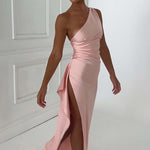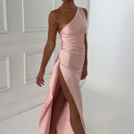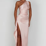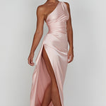 Osjećajte se kao božica koju jeste u Arielu, našoj premium haljini izrađenoj od luksuznog, laganog satena s elastinom koji obavija vaše obline. S drapiranim detaljima i dizajnom na jedno rame, maxi haljina se vuče po podu i završava visokim prorezom do bedra. Stilizirajte je s ravnom kosom, mini torbicom i potpeticama.