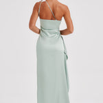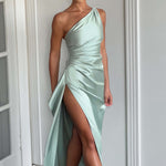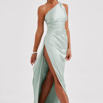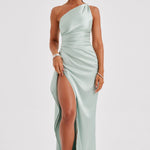 Osjećajte se kao božica koja jeste u Ariel, našoj premium haljini izrađenoj od luksuznog, laganog satena s elastanom koji se prilagođava vašim oblinama. S drapiranim detaljima i dizajnom s jednim ramenom, maxi haljina se vuče po podu i ima visoki prorez do buta. Stilizirajte svoju uz glatku kosu, mini torbicu i sandale s potpeticama.