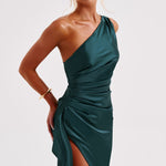 Osjećajte se kao božica koja jeste u Ariel, našoj premium haljini od luksuznog, laganog satena s elastinom koji se prilagođava vašim oblinama. S drapiranim detaljima i jednim ramenom, maxi haljina se proteže do poda i ima visoki prorez do buta. Stilizirajte je s ravnom kosom, mini torbicom i cipelama s potpeticama.