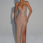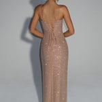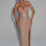 Ashton Maxi Haljina u zlatnoj boji izrađena je od rastezljivog krepa bogato ukrašenog hotfix rhinestones kamenčićima. Ima naramenice, oblikovani dekolte, otvoreni leđa sa vezanjem i visoki prorez do bedra, sve to prelijeva se u elegantnu suknju u obliku kolone.