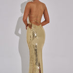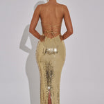 Uživajte u raskoši naše Atari Maxi Haljine - upečatljive zlatne boje, izrađene od luksuznih ravnih zrcalnih šljokica i satenske podstave. Njezina ravna dekoltea i suknja u obliku kolone isijavaju sofisticiranost, dok leđni vez i središnji prorez dodaju dašak dramatičnosti. Nevidljivi zatvarač osigurava besprijekoran i elegantan fit, savršen za svaku posebnu priliku.