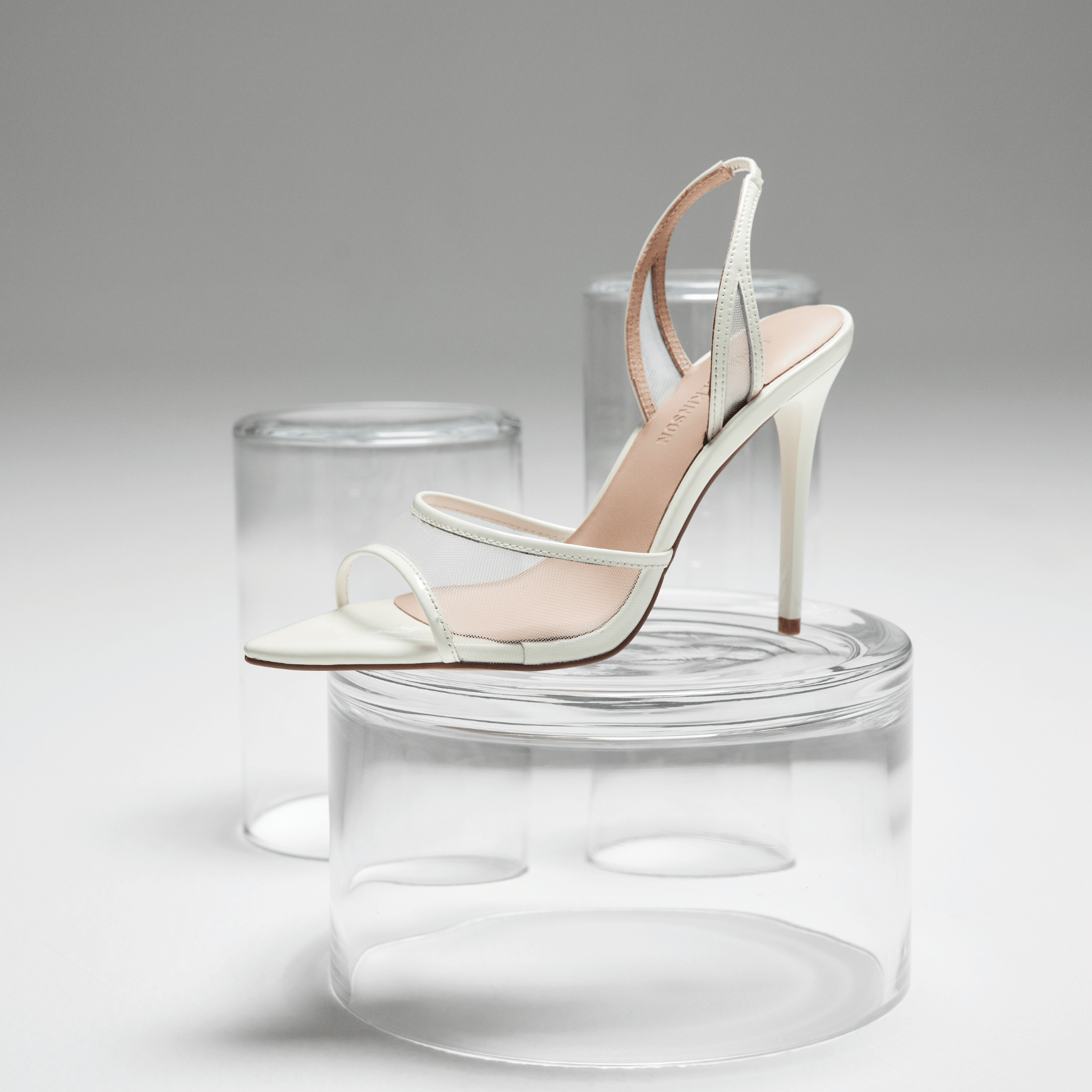 Izrađena od prozirne mreže s kožnim detaljima, ova slingback štikla balansira delikatnost i snagu. Gotovo neprimjetna silueta produžava noge, dok otvoreni špicasti nožni prst dodaje ženstveni završetak.