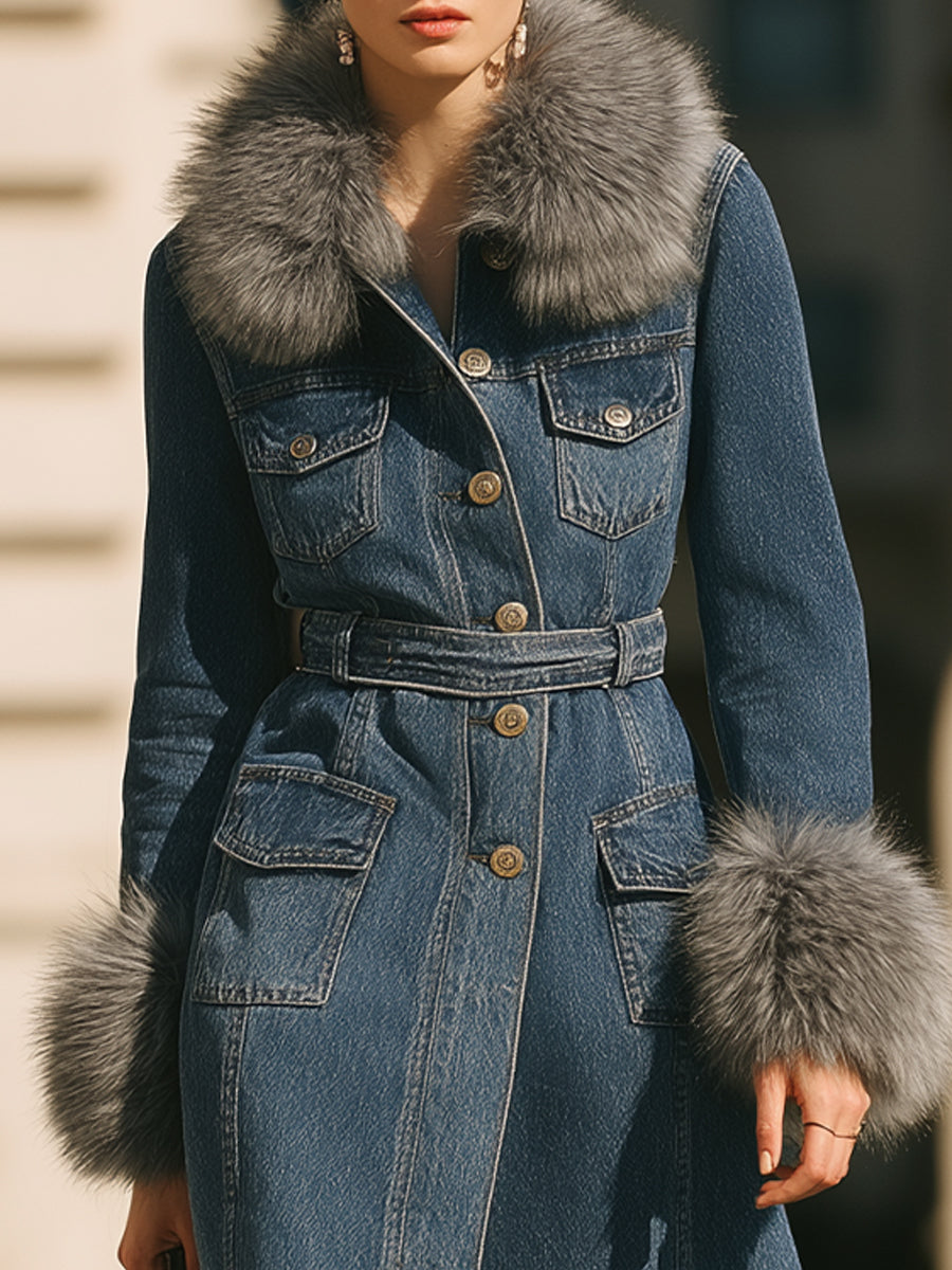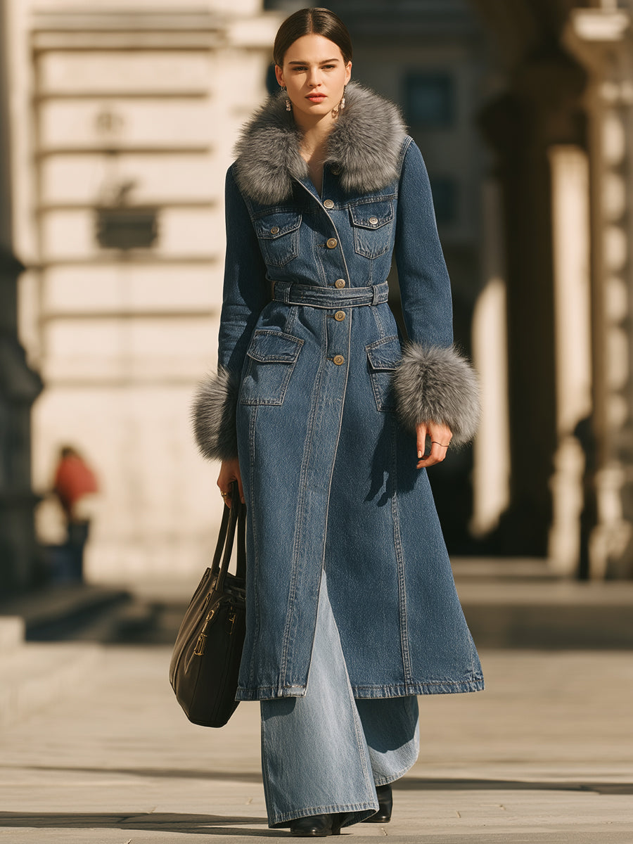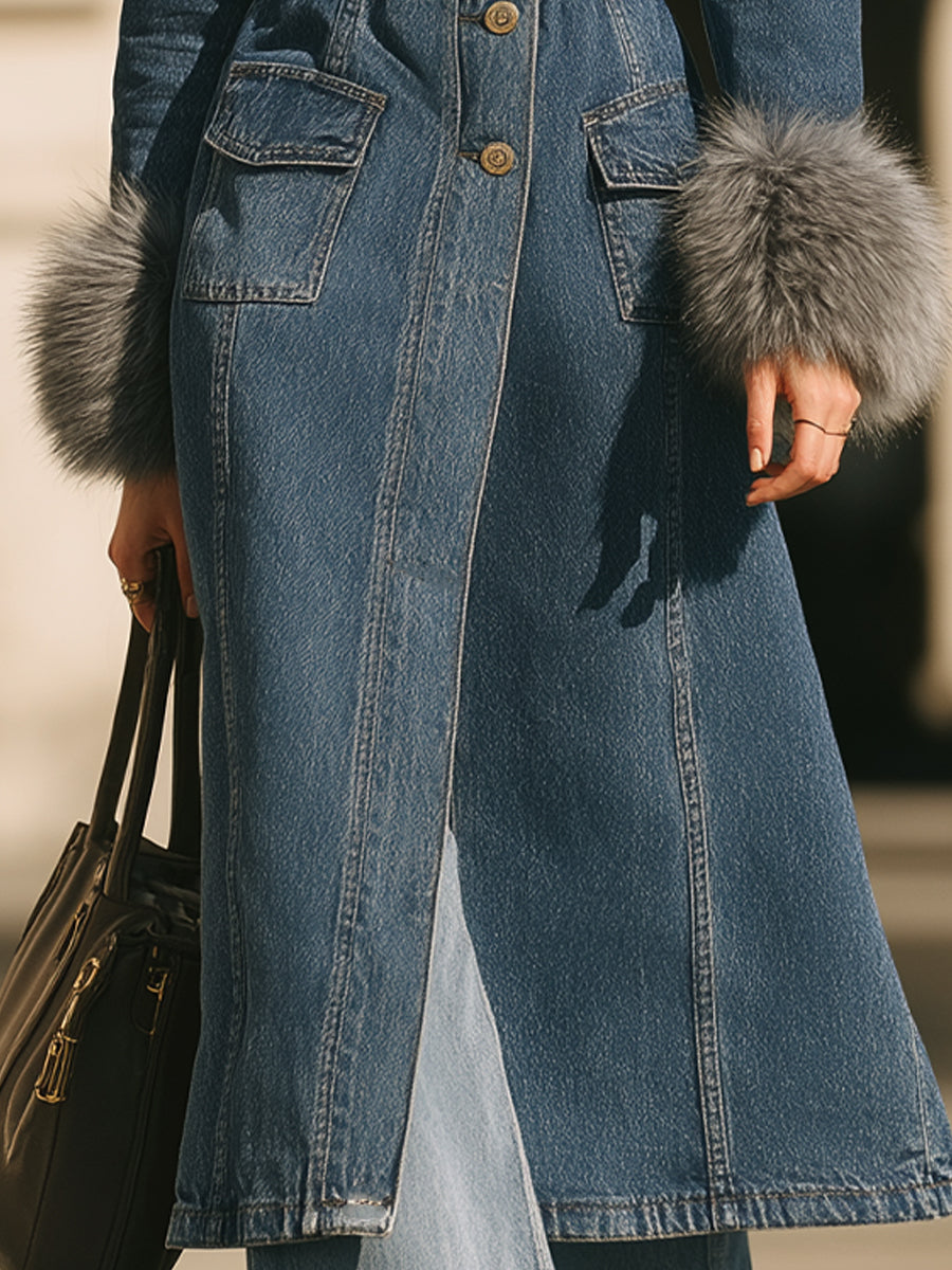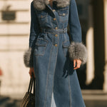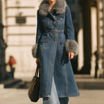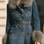 Džínový trenčkot Mooyius s límcem a manžetami z umělé kožešiny je dokonalou kombinací klasického denimu a moderní sofistikovanosti. Tento kabát, navržený pro sebevědomou ženu , proměňuje nadčasovou látku v městský luxus.