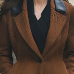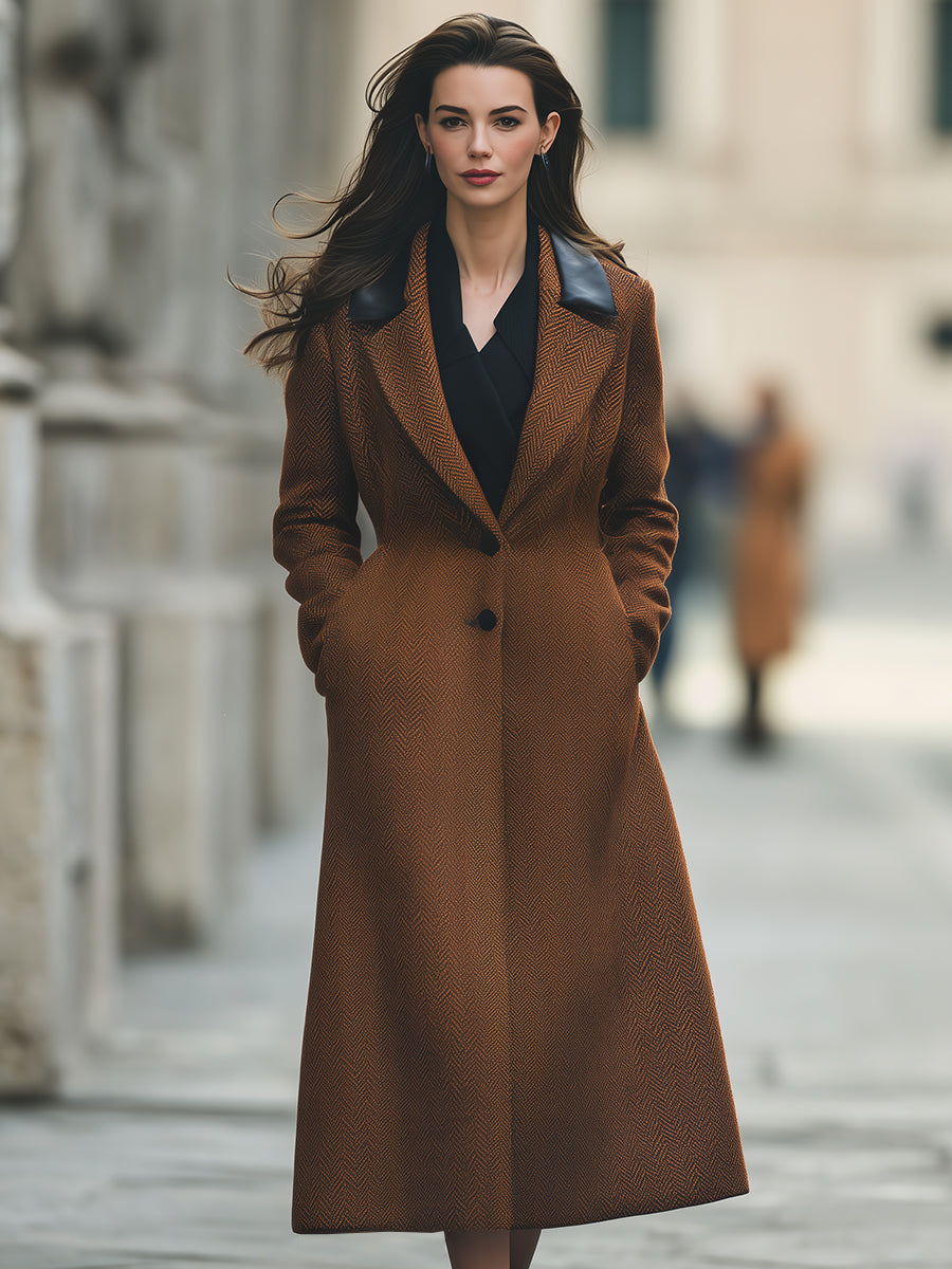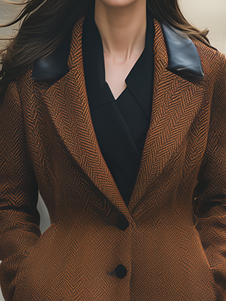 Výrazným prvkem jsou kontrastní límce z umělé kůže , které klasickému vzoru rybí kosti dodávají elegantní a moderní vzhled.