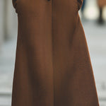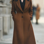 Rezavě zbarvený kabát s ryzí kostí a rafinovaným střihem se vyznačuje jednořadým zapínáním a prodlouženým lemem , který elegantně sahá pod kolena.