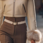 Tato bunda, vyrobená z hladké, texturované umělé kůže, plynule přechází mezi elegantním denním vzhledem a elegantními večerními outfity. Luxusní kožešinové detaily dodávají hřejivost a texturu, zatímco odnímatelný design zajišťuje přizpůsobivost v různých ročních obdobích a příležitostech.