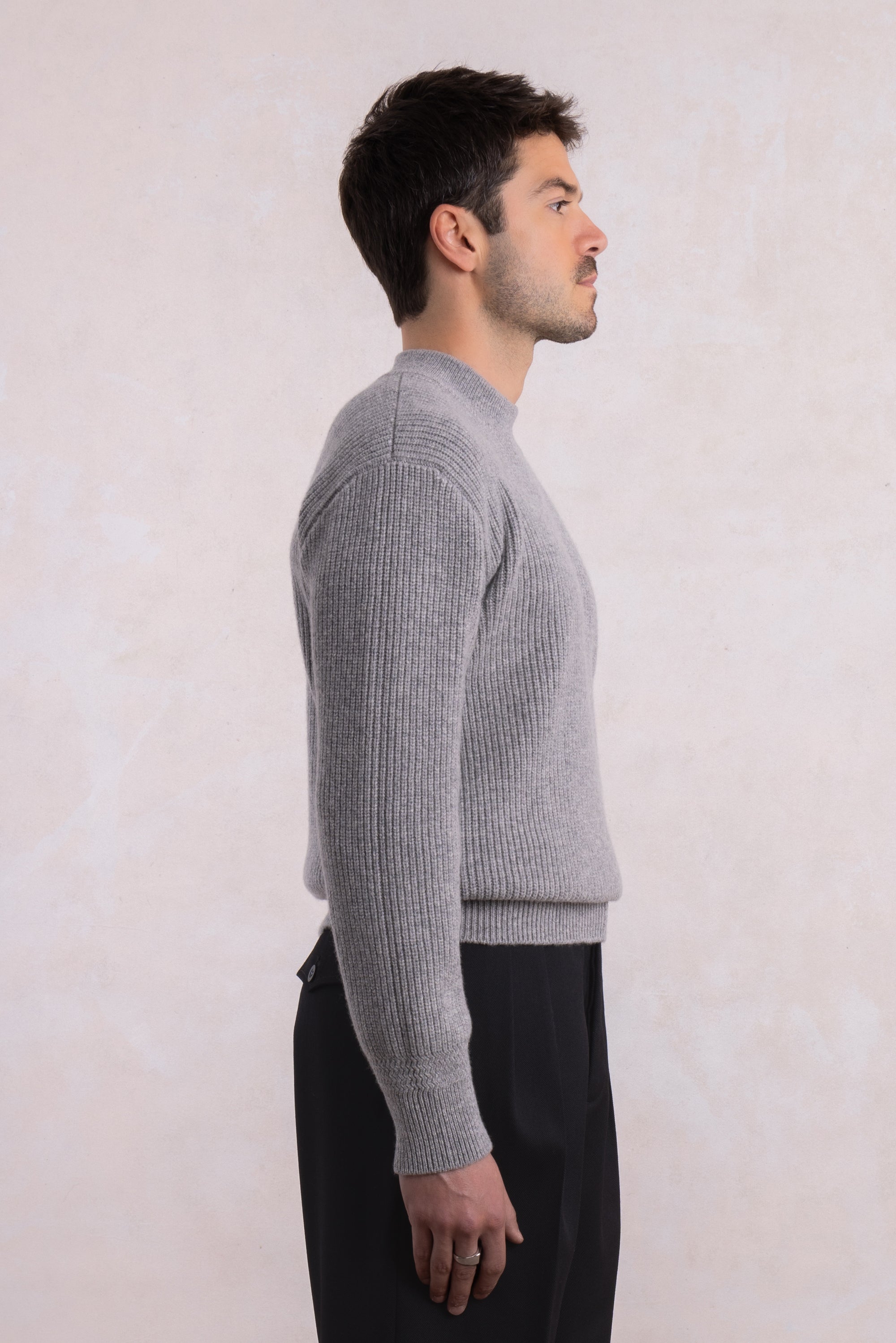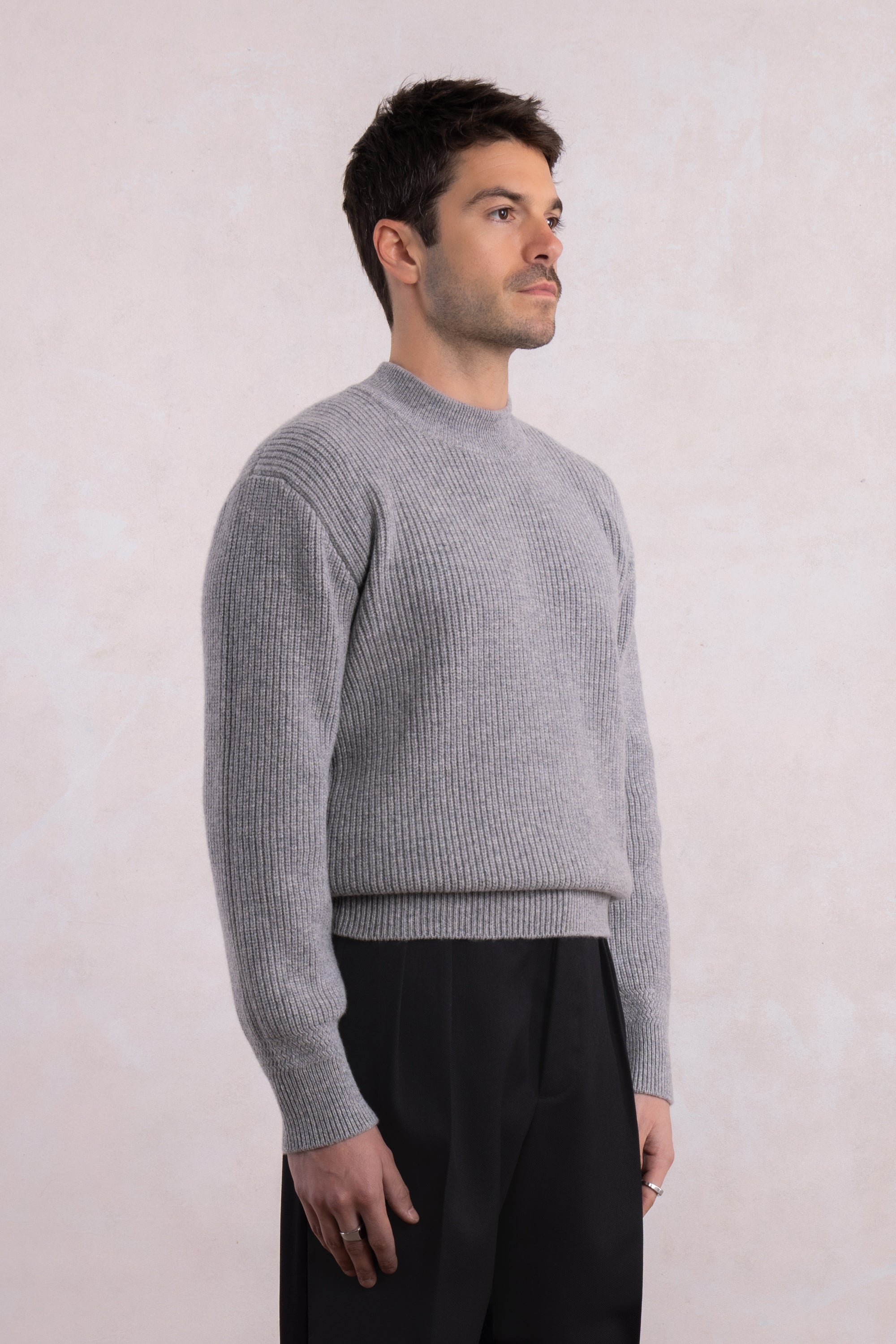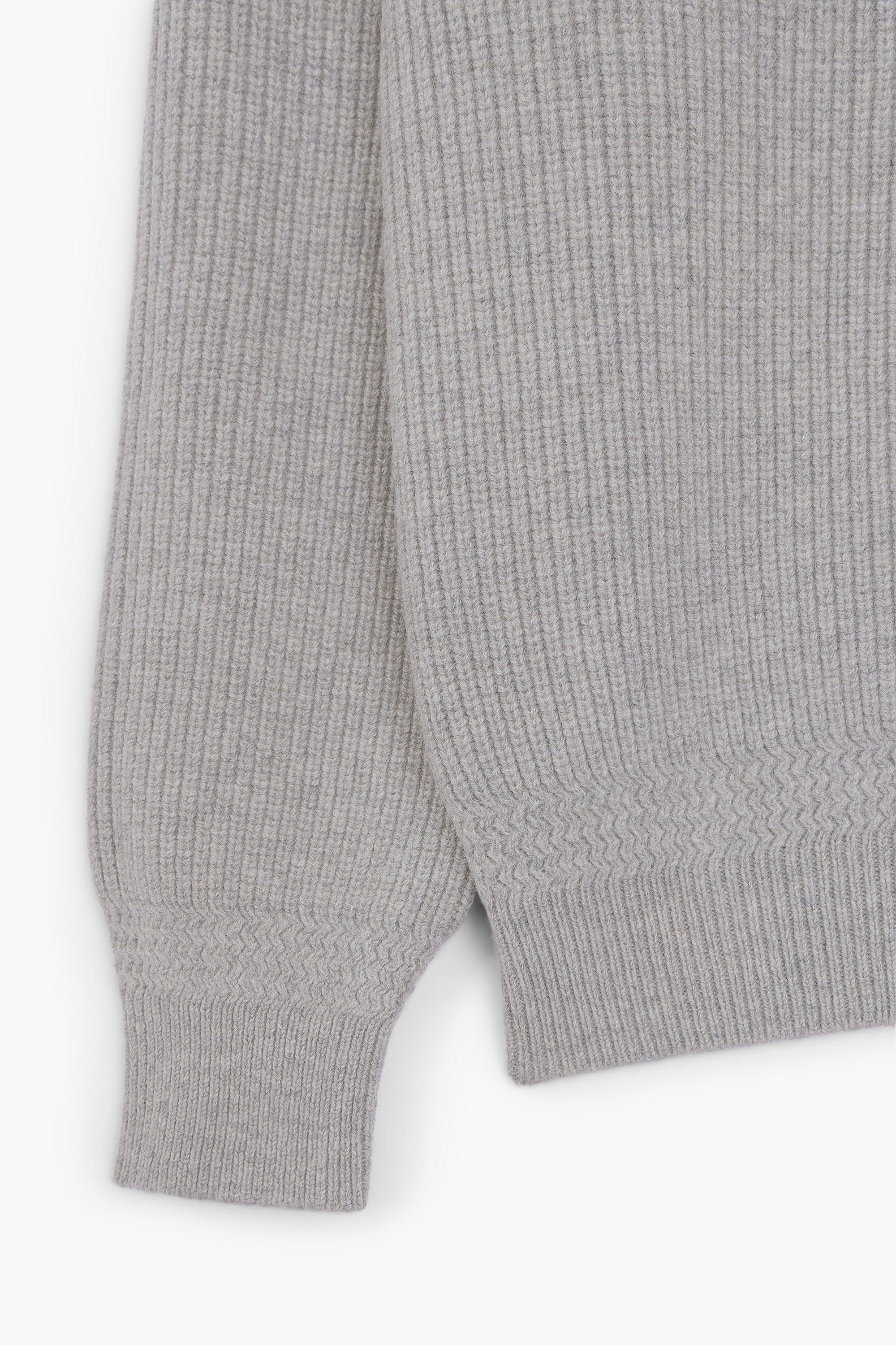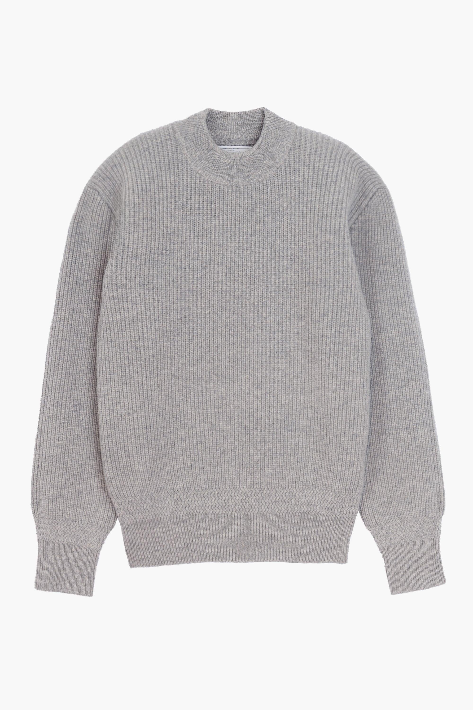 Tento svetr z jehněčí vlny, inspirovaný svetry „Deck Sweater“, které nosilo americké námořnictvo během druhé světové války, je reinterpretován anglickým žebrováním (rybářským žebrováním) pro texturu, která je zároveň robustní a elegantní.