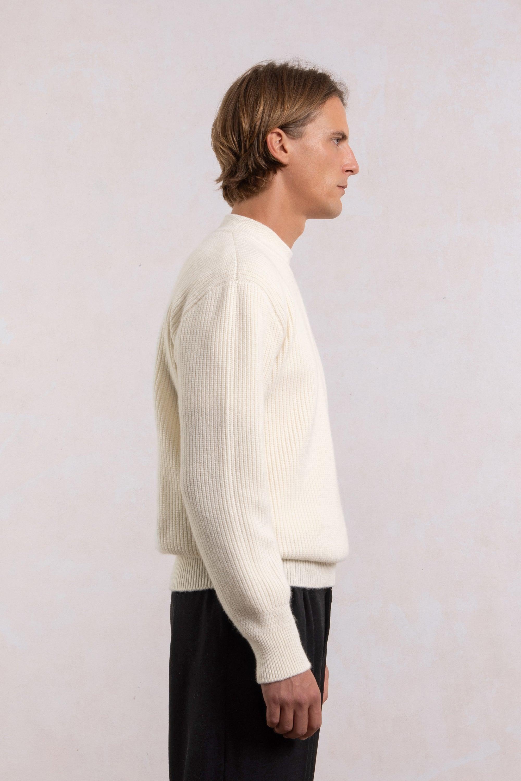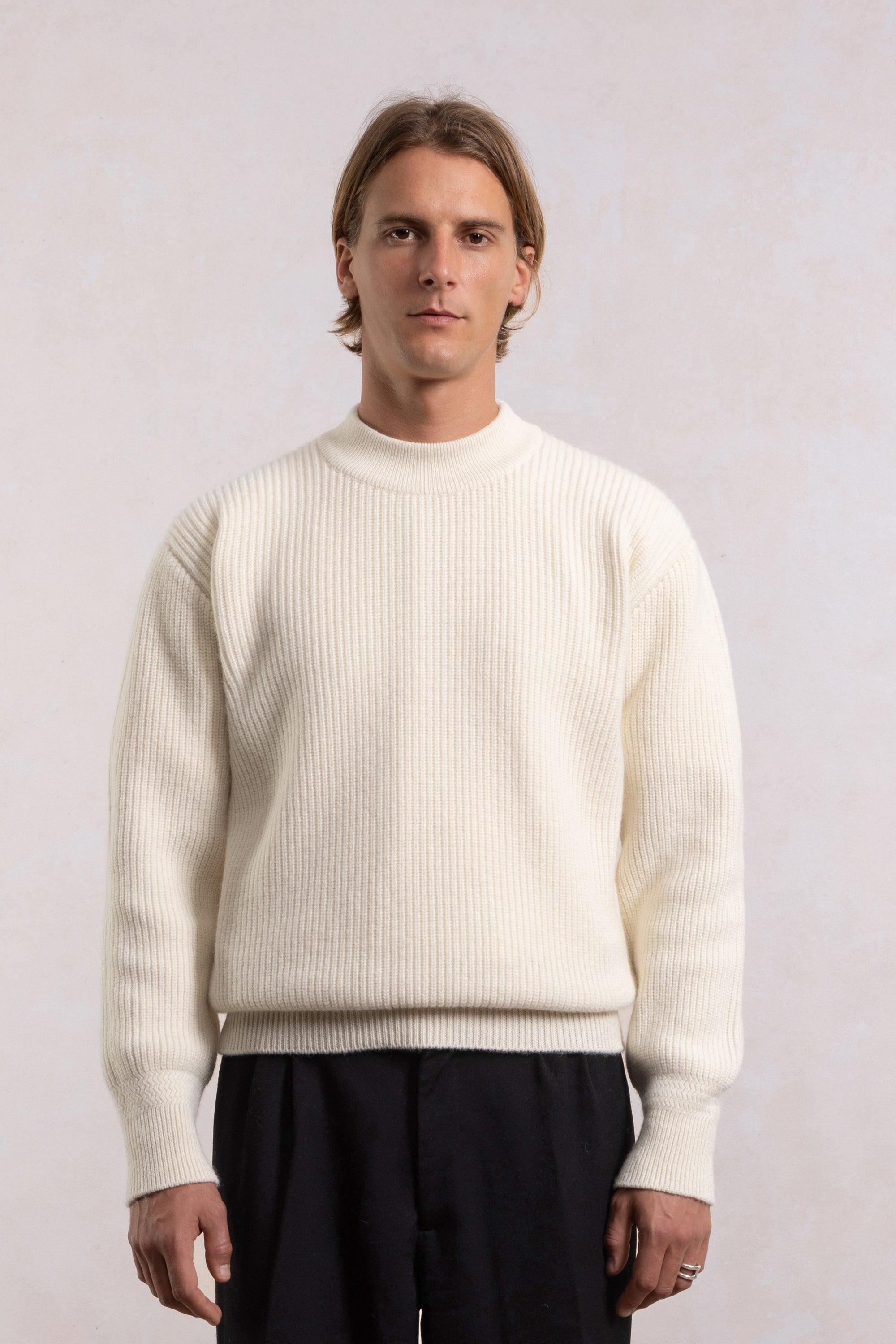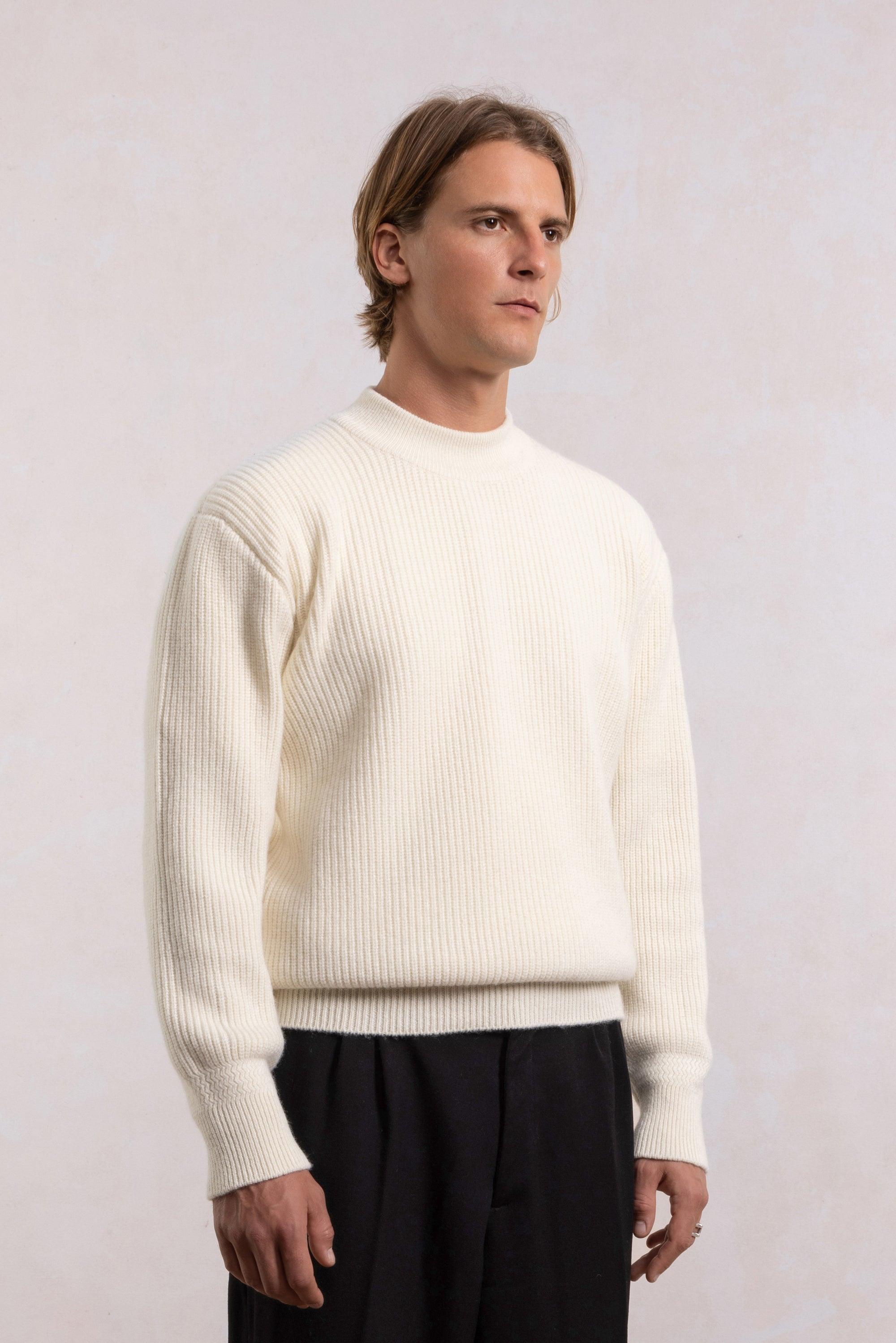 Svetr Deck je inspirován americkým námořnictvem z druhé světové války a je vyroben z jehněčí vlny s anglickým žebrováním (rybářským žebrováním) pro dokonalou kombinaci robustnosti a elegance .