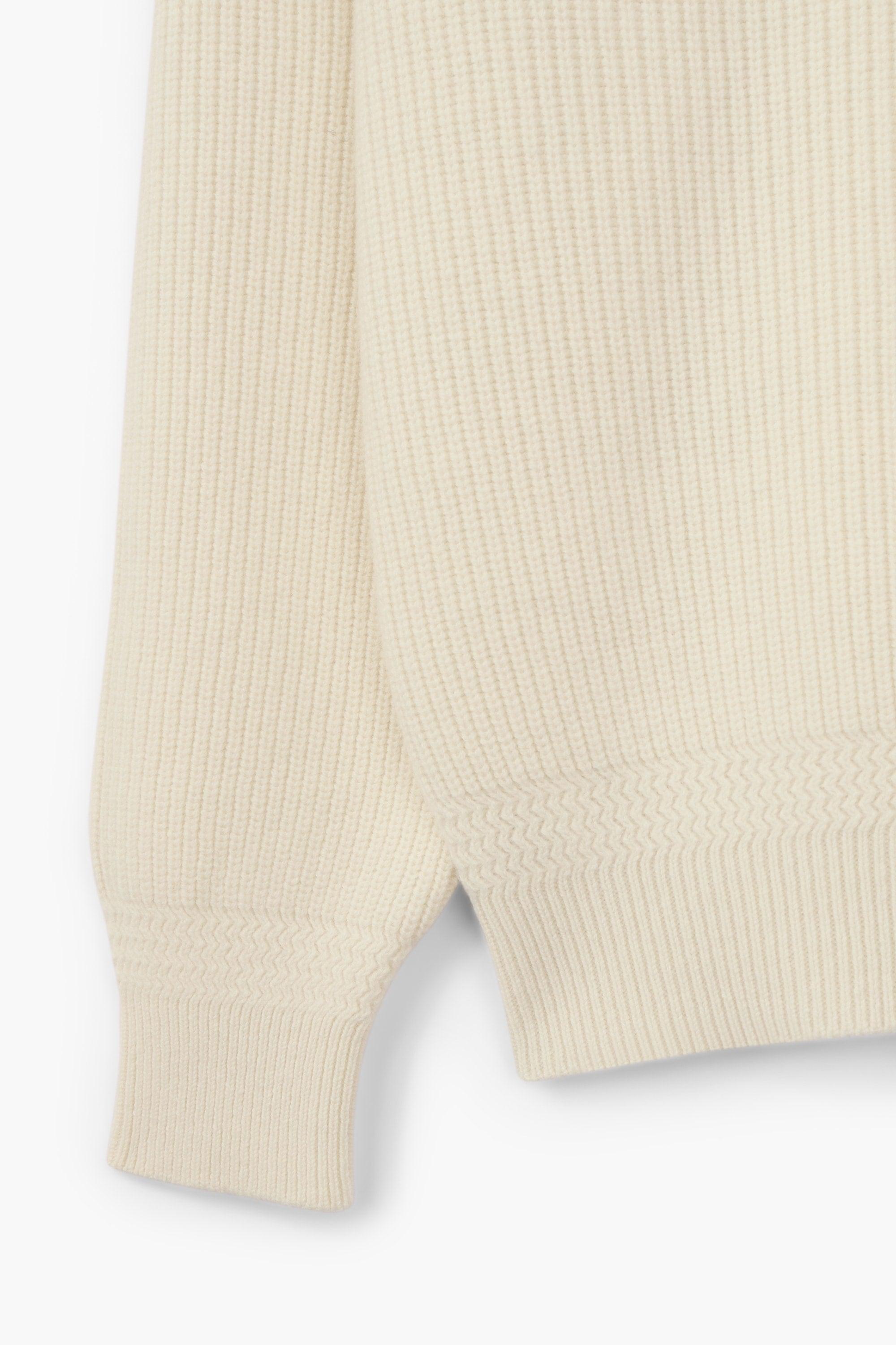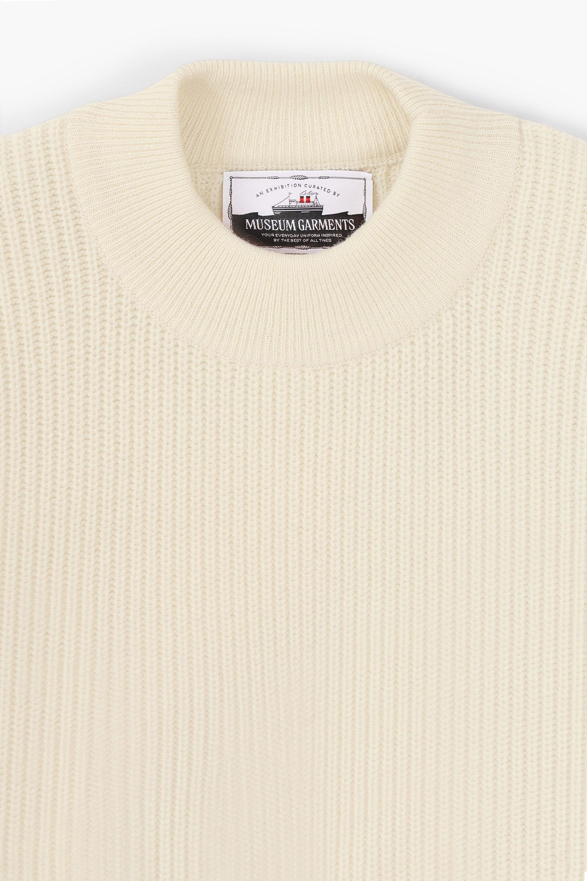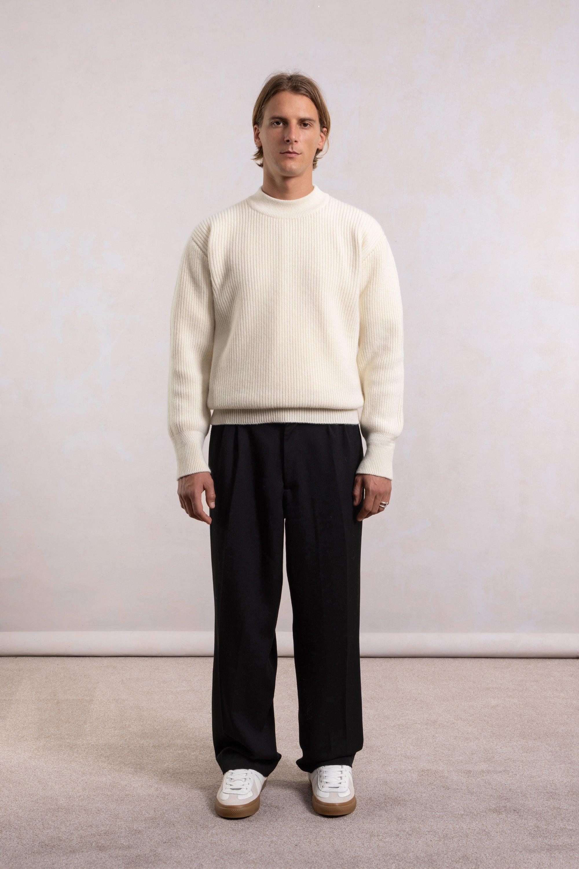 Svetr Deck je inspirován americkým námořnictvem z druhé světové války a je vyroben z jehněčí vlny s anglickým žebrováním (rybářským žebrováním) pro dokonalou kombinaci robustnosti a elegance .