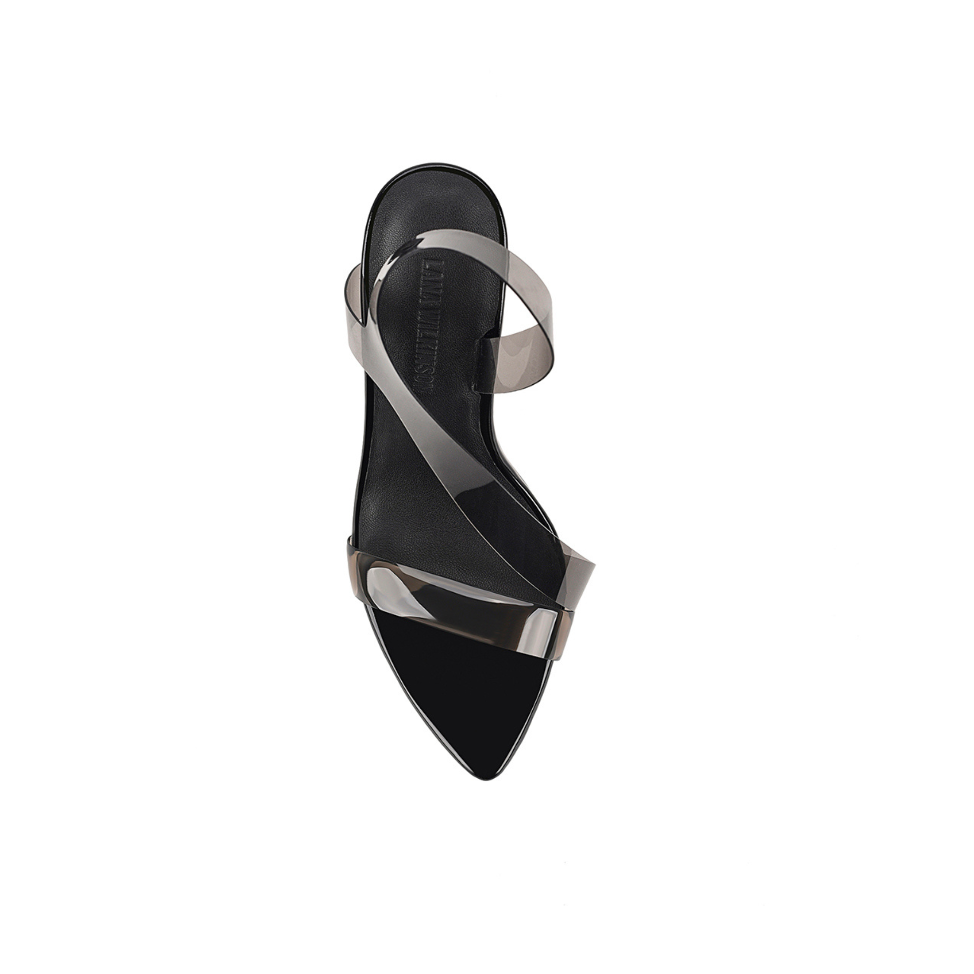 Sandály Missy v černé barvě jsou výraznou, moderní a poutavou klasikou. Tyto sošné sandály s elegantními vinylitovými pásky zahalují nohu do téměř nepostřehnutelné elegance a vytvářejí výraznou siluetu s ostrou špičatou špičkou.