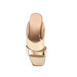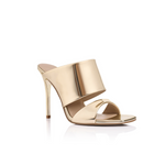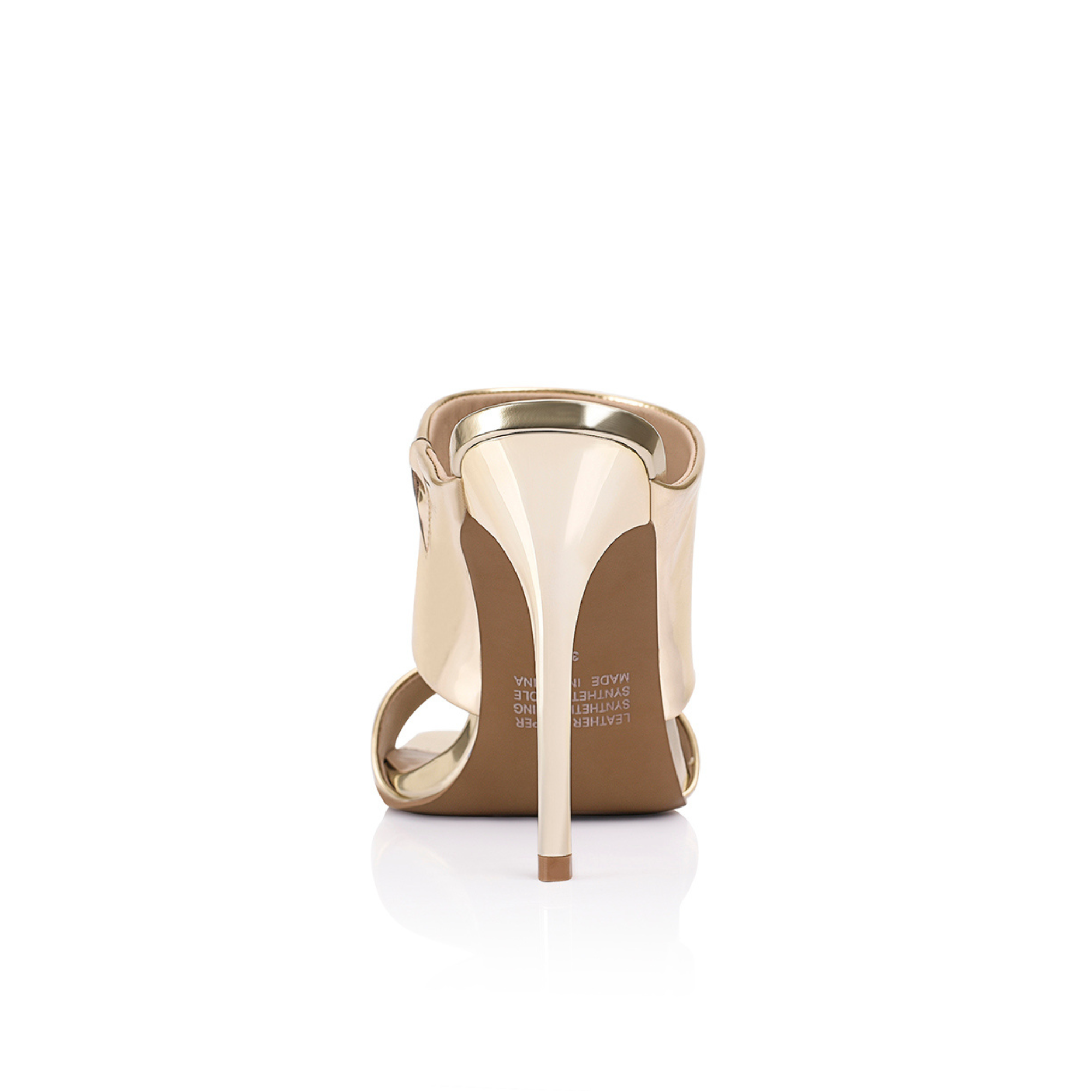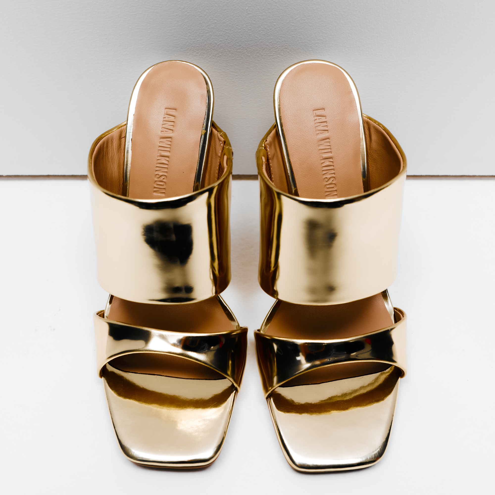 Montana přitahuje pozornost svou výraznou siluetou a vysokým leskem. Tyto sošné pantofle, vyrobené z výrazné zlaté zrcadlové kůže, mají dva široké, výrazné pásky, které stylově a bezpečně obepínají nohu.