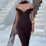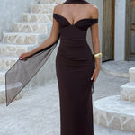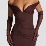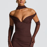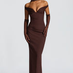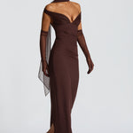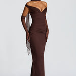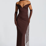 Maxi šaty Abigail ve švestkově hnědé barvě kombinují eleganci s promyšleným designem. Mají hluboký výstřih s bardotovým vzorem, plisovaný tylový detail na hrudi a asymetrické řasení v pase. Sloupková sukně s rozparkem uprostřed na zádech vytváří sofistikovanou siluetu z luxusního nepružného krepu.