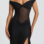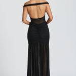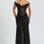 Pozdvihněte svůj večerní outfit s maxi šaty Alaia v zářivě černé barvě. Tento sofistikovaný design se vyznačuje průsvitným síťovaným topem s elegantním výstřihem Bardot a elastickými zády pro pohodlí. Sukně má nízký pas s úzkými řaseními kolem boků pro tvarovaný vzhled, který plynule přechází do průsvitné sukně s výrazným rozparkem až po stehna.