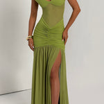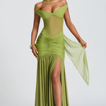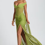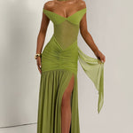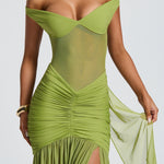 Pozdvihněte svůj večerní outfit s maxi šaty Alaia v sytém olivovém odstínu. Tento sofistikovaný střih se vyznačuje průsvitným síťovaným živůtkem s elegantním výstřihem bardot a elastickými zády pro perfektní střih. Volány v bocích a snížený pas tvarují siluetu a přecházejí do plné, plisované průsvitné síťované sukně s výrazným rozparkem až po stehna pro nenucené dramatické efekty.