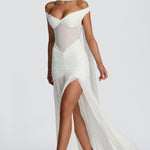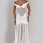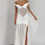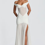 Dlouhé šaty Alaia ve slonovinové barvě kombinují strečový žerzej s průsvitnou síťovinou, mají výstřih s bardot vzorem, nařasené boky a vysoký rozparek pro elegantní sofistikovanost.