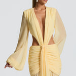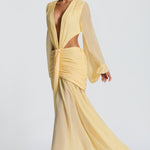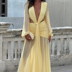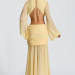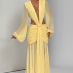Maxi šaty Andrina's Lemon jsou vyrobeny z lehké krajky, mají hluboký výstřih a dlouhé průsvitné rukávy. Jejich otevřená záda s detailem zavazování a skládaný panel po stranách vytvářejí lichotivou siluetu, zatímco plná, poloprůsvitná skládaná sukně dodává elegantní pohyb.
